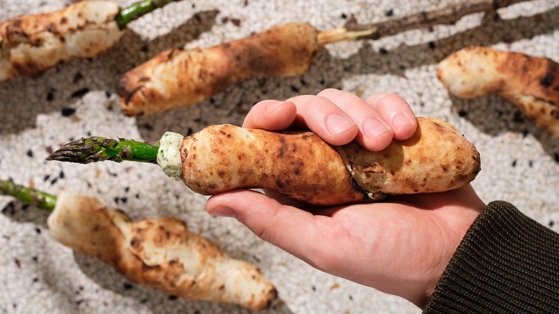 Kom en god klat tatarsovs i brøddene efterfulgt af en asparges.