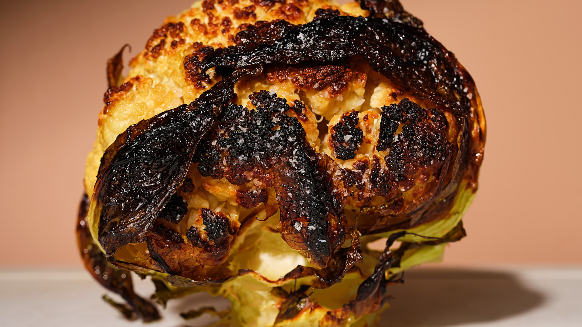 Dæk en bradepande med bagepapir og bag blomkålen på bradepanden i cirka 30 minutter, indtil det har fået en dyb, mørk overflade. Det gør ikke noget at det bliver sort. Rotér evt. blomkålen undervejs hvis din ovn bager ujævnt.