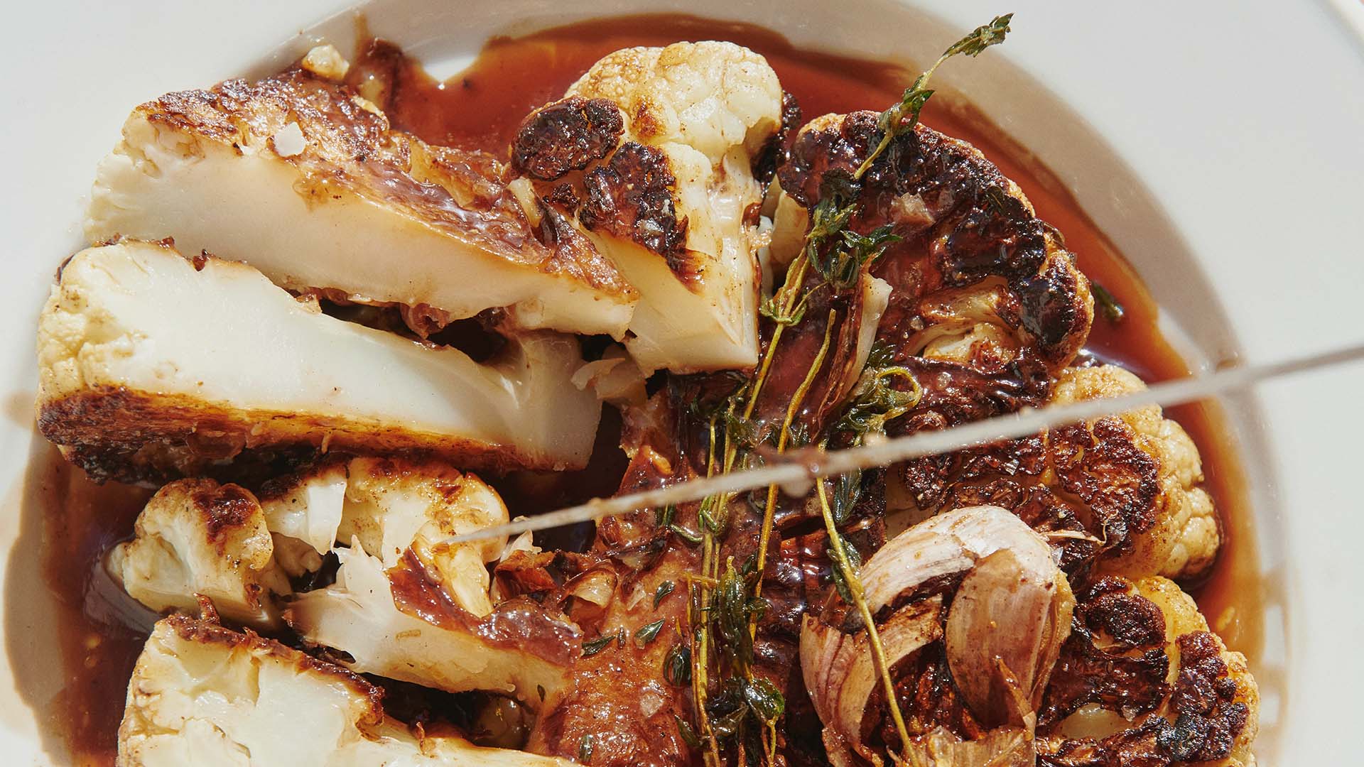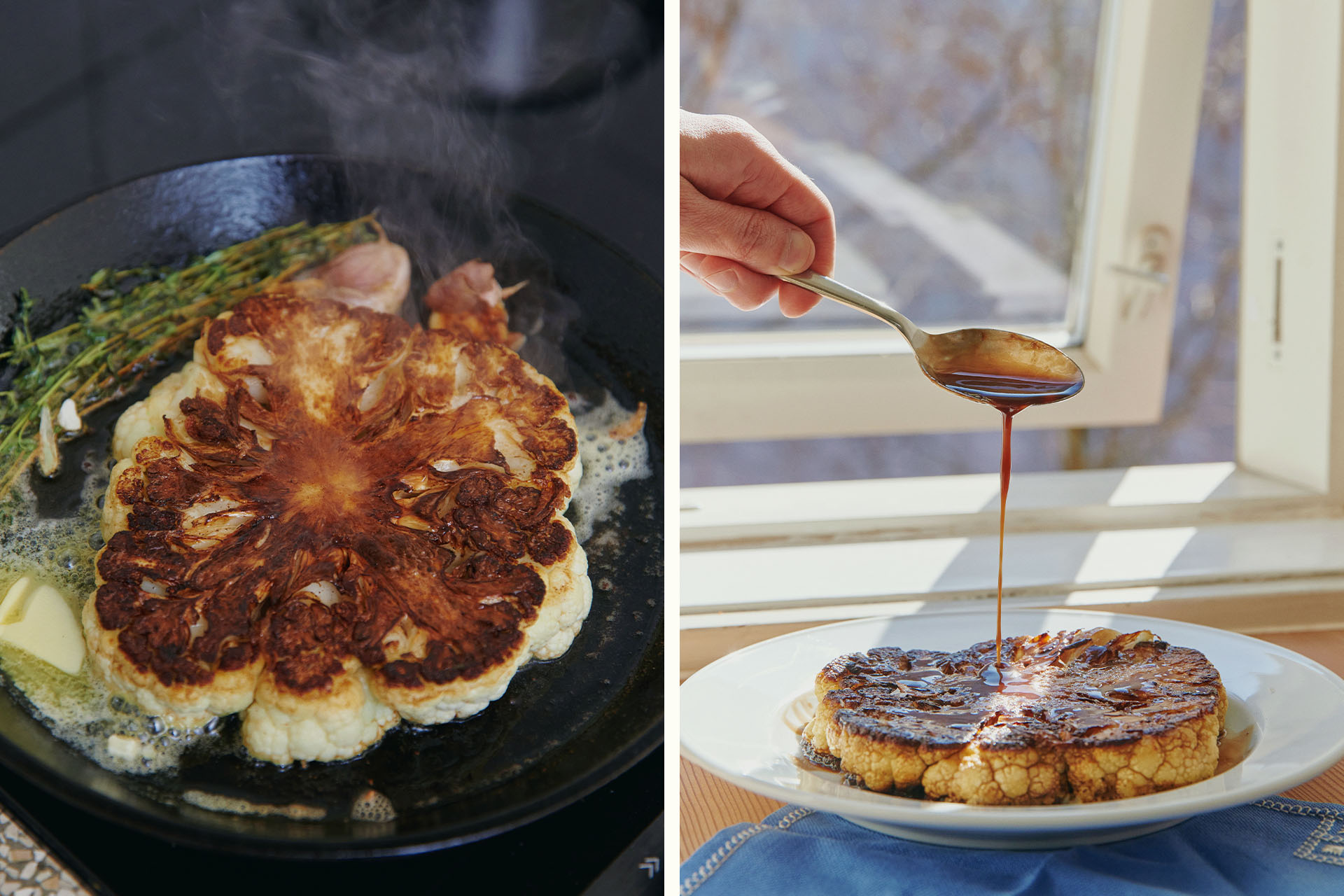 Når smørret er smeltet, steges blomkålen på den ene skæreside i ca. 7-8 minutter, indtil det har fået godt med farve.