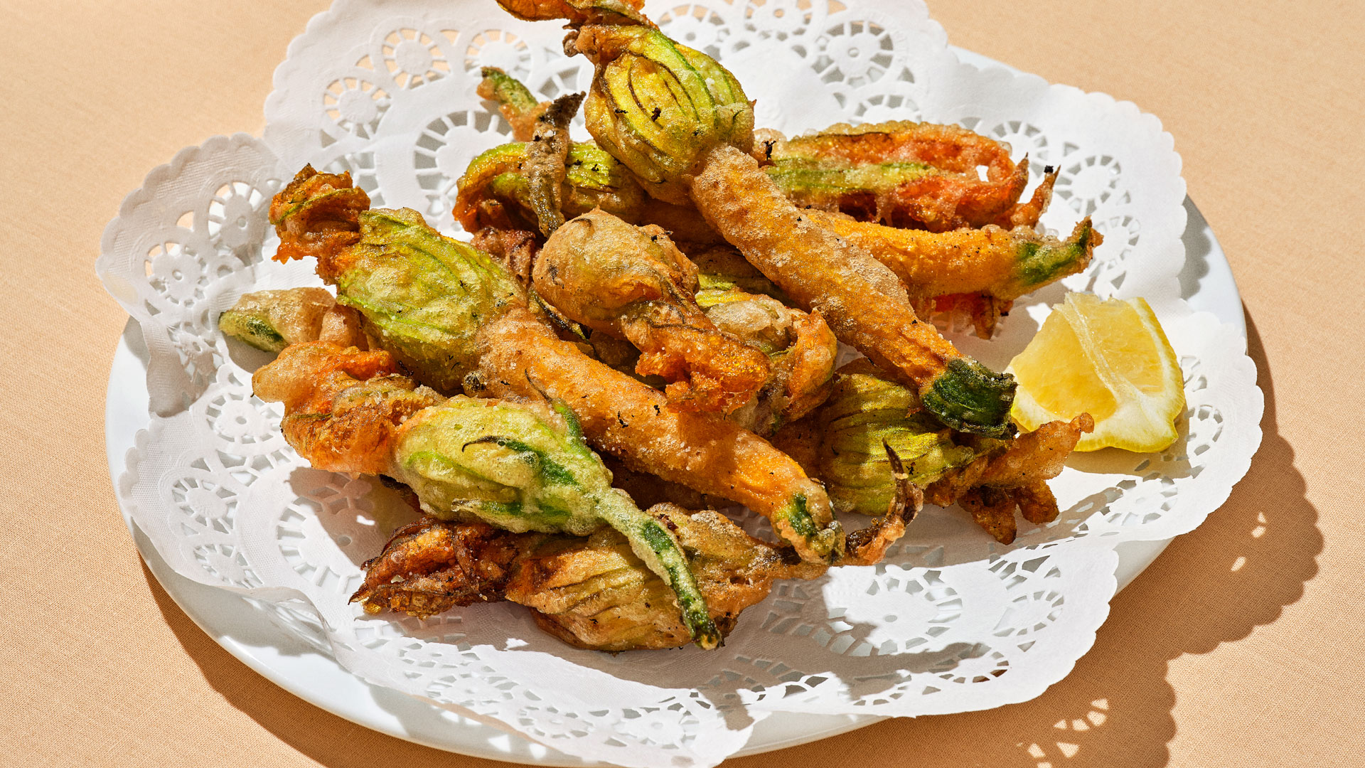 Friterede squashblomster, farseret med kantareller og ricotta